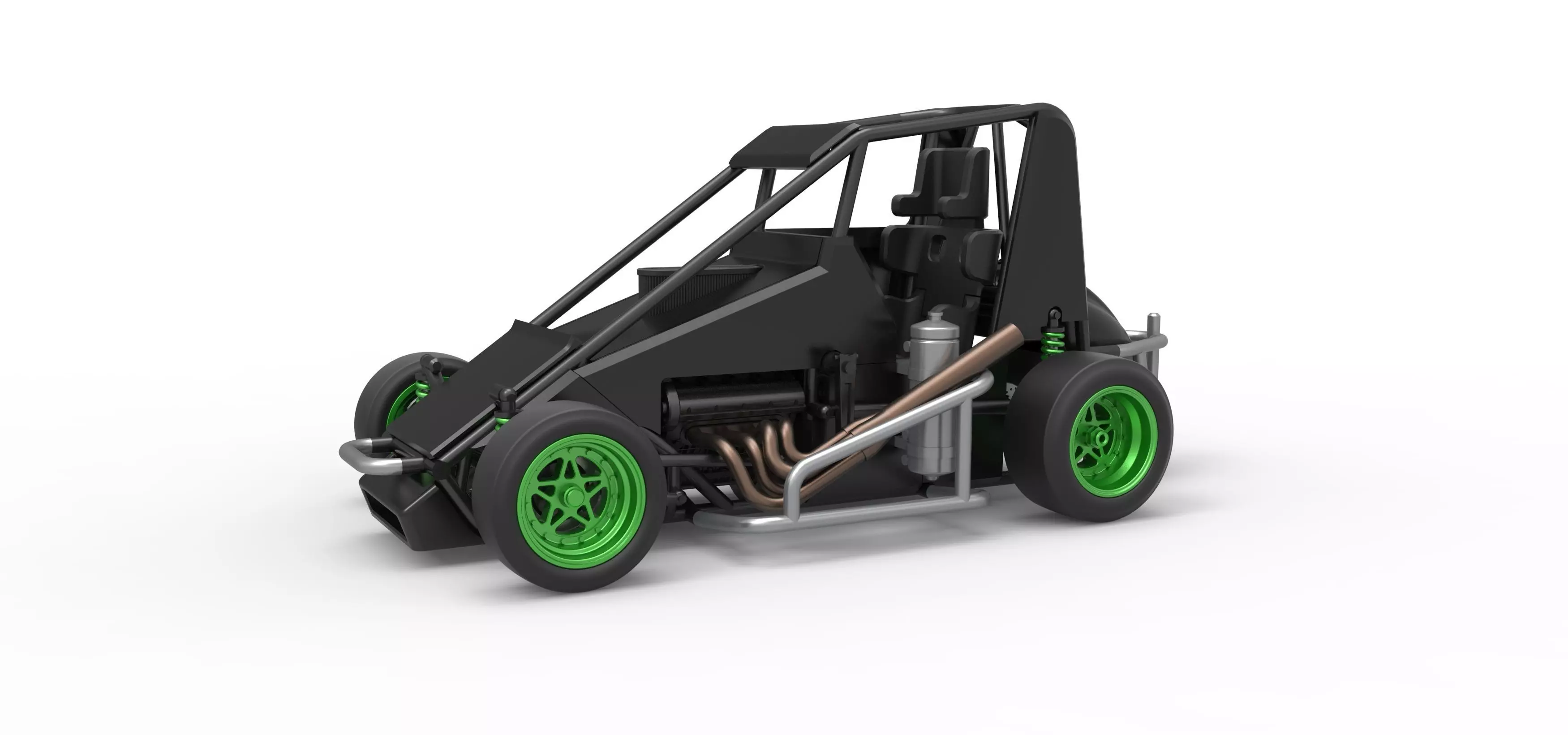 The model consists of parts: Air filter, Air intake, Body, Engine, Exhaust pipes part 1,2, Front rims, Front tires, Fuel tank, Oil tank, Radiator, Rear left rim, Rear left tire, Rear right rim, Rear right tire, Seat part 1,2, Shell central part 1-4, Shell left part 1-5, Shell right part 1-3, Steering wheel.