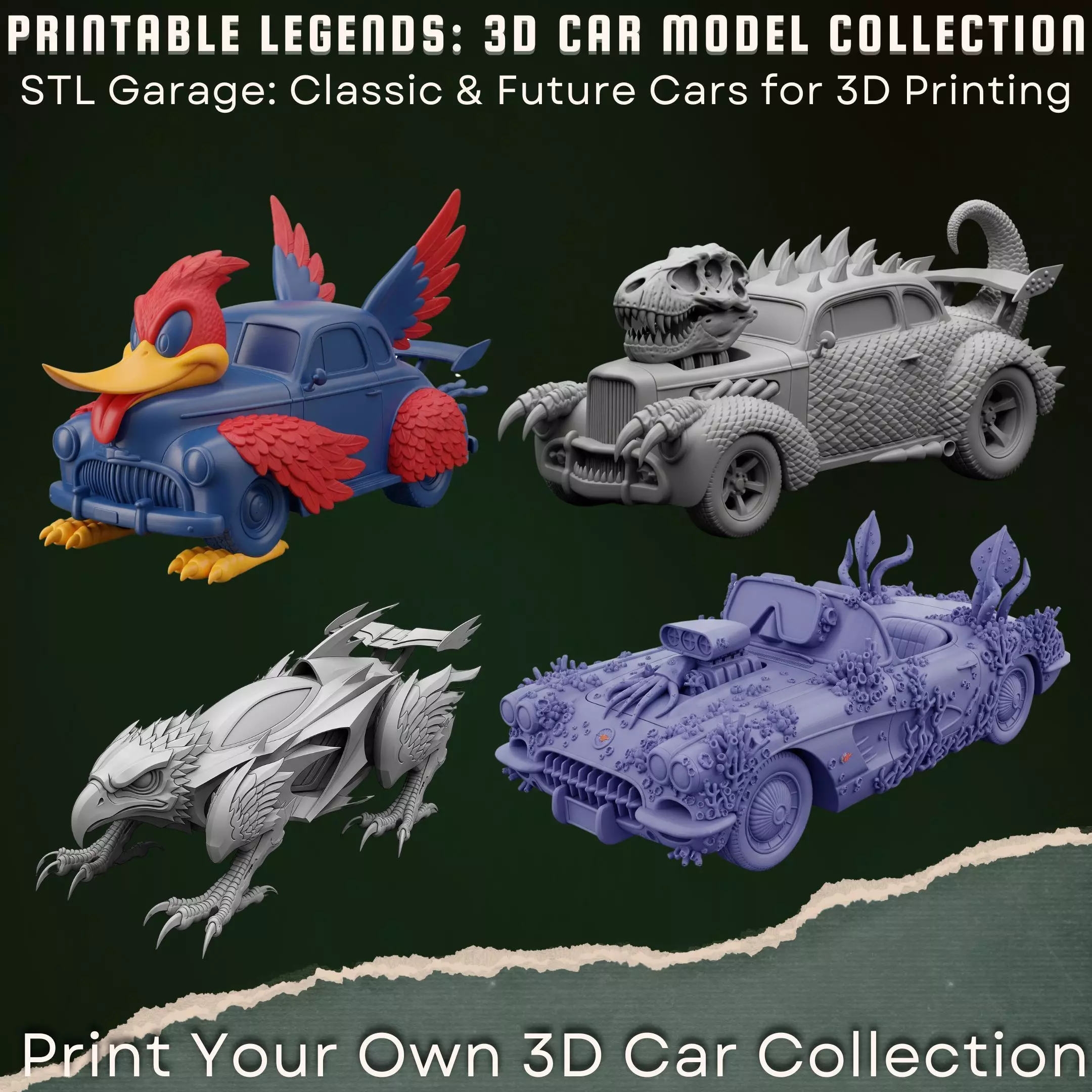 This collection features four imaginative vehicle models inspired by nature, mythology, and cartoon aesthetics. Each model transcends traditional car design by merging with a creature, character, or natural element. The set includes a fearsome dinosaur hot rod, a cartoon-style bird vehicle, an ocean-covered sunken beast, and a mythological griffon-themed car. It's a striking and original series perfect for collectors and 3D printing enthusiasts.Technical Details: