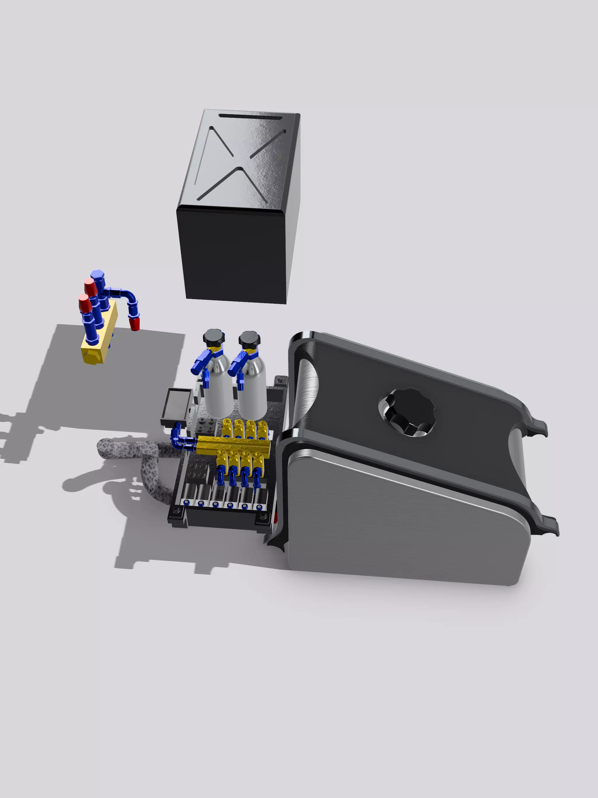 Designed from scratch is the fuel assembly mounted to the chassis of a Funny Car tubular chassis. This includes the fuel cell, cap & covers, fuel hoses, AN fittings, fuel log, and the complete detailed fuel valves & jets assembly with CO2 cans, computer & 2 piece box.