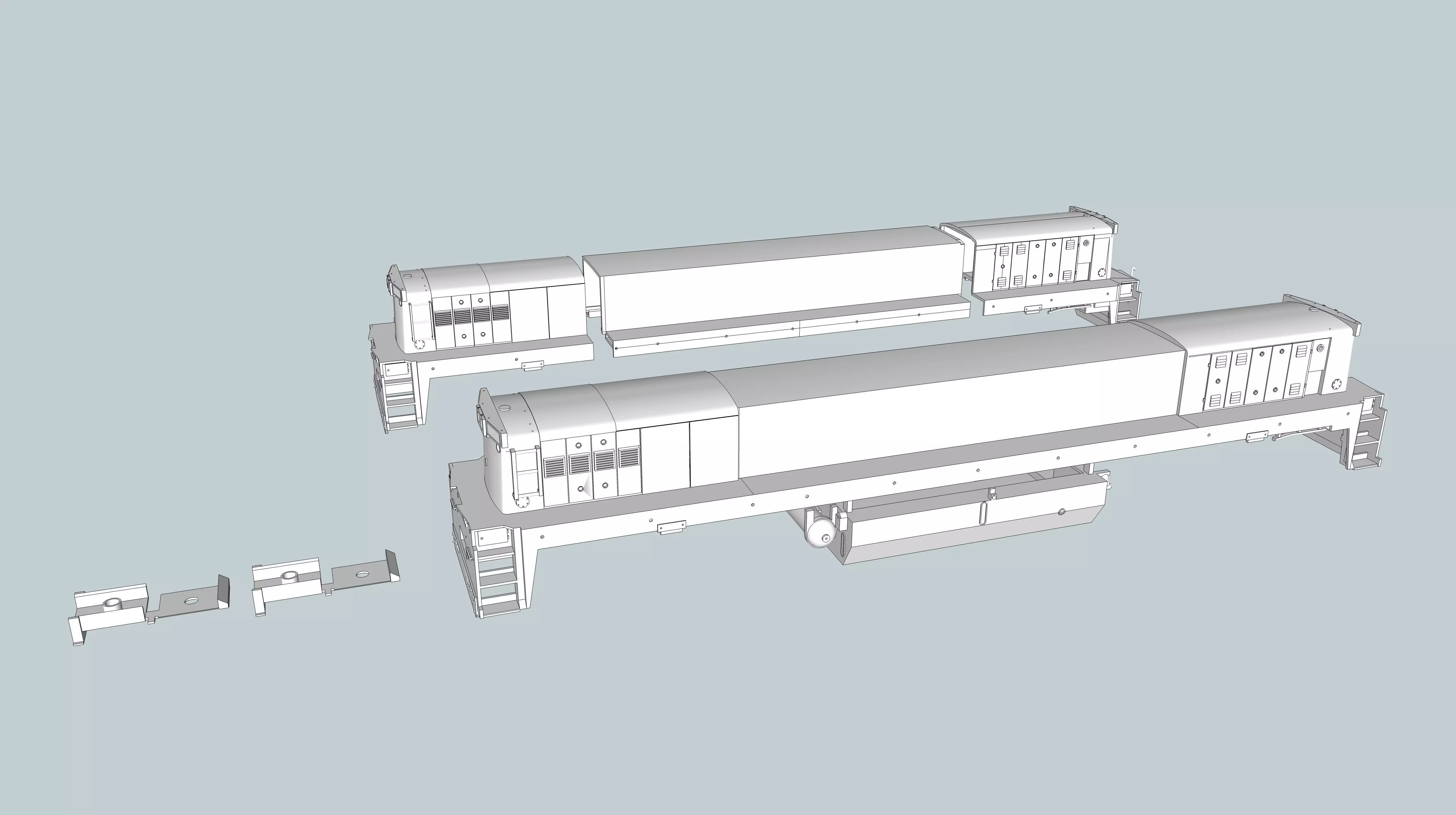 Double-ended GE MATE. Included are printable STL files as well as a Sketchup file in both HO 1/87 scale and N 1/160 scale. The Sketchup files are water tight, print ready, and can be edited and rescaled. Note that the scaling in the Sketchup files is ten times larger than the scale size due to Sketchup performing poorly at tiny scales. Included is a three part HO shell in case you're using a small resin printer (length is 7.8 inches or 20 cm). Resin printing is highly recommended, especially at N scale due to so many fine details and prototype accurate thin parts.