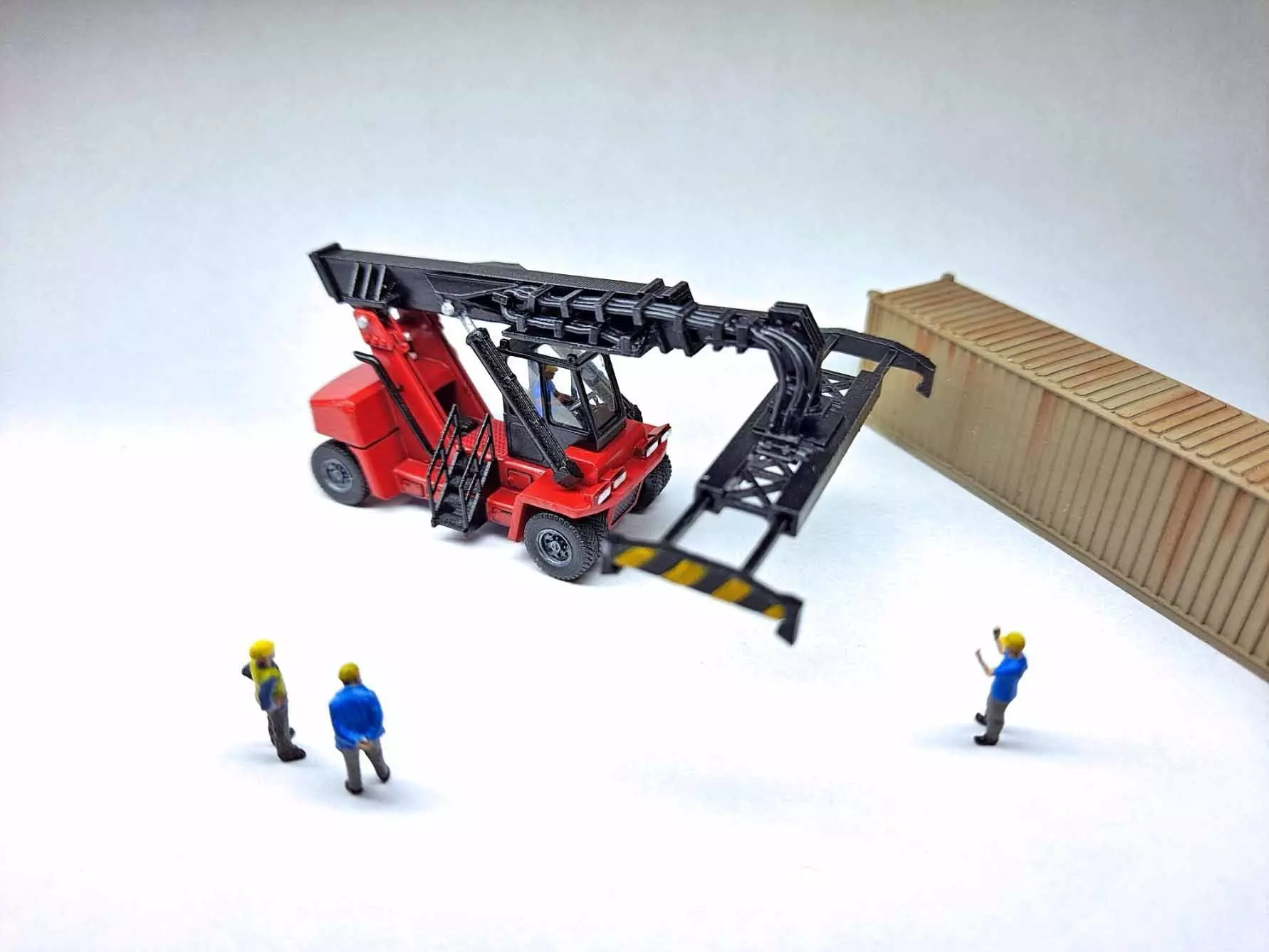 You can build the lifter in any position however the arm wires always came loose from the glue when I moved the parts. This might have been due to the wire type I used. If you build it with the cable run, I recommend you glue all the parts and make the model static. Also, if you model the lifter carrying a container, you likely will need to glue the wheels to your layout as the body is not heavy enough to carry it without falling forward.