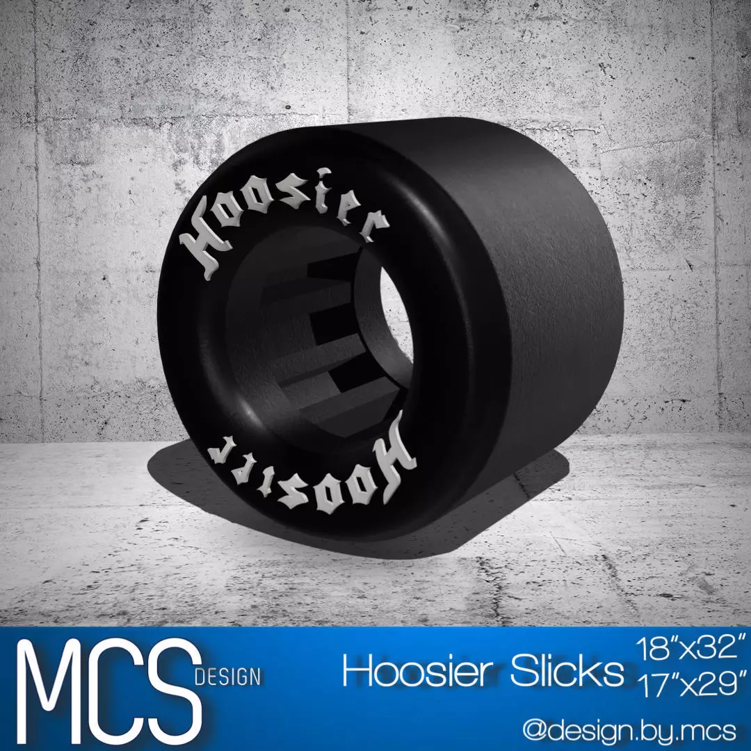Designed from scratch is a Hoosier Drag slick rear tire, in a scale size of 15wheel size, 2 sizes 32 tall, and 17tread footprint, or 18x29 with 2xHoosier" script on both sides for detailing. high in detail, ideal for scale modeling (currently in 1/24 and 1/25 scale).