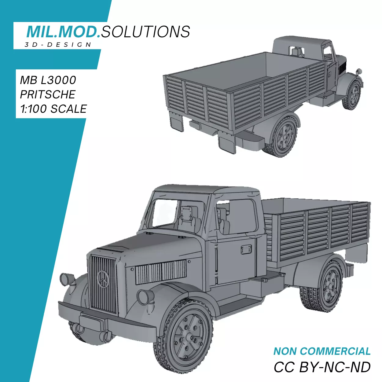Zum Modell:Die STL-Dateien umfassen mehrere Druckmöglichkeiten des Mercedes Benz L 3000, welche alle auf Basis des Maßstabs 1:100 angefertigt sind.