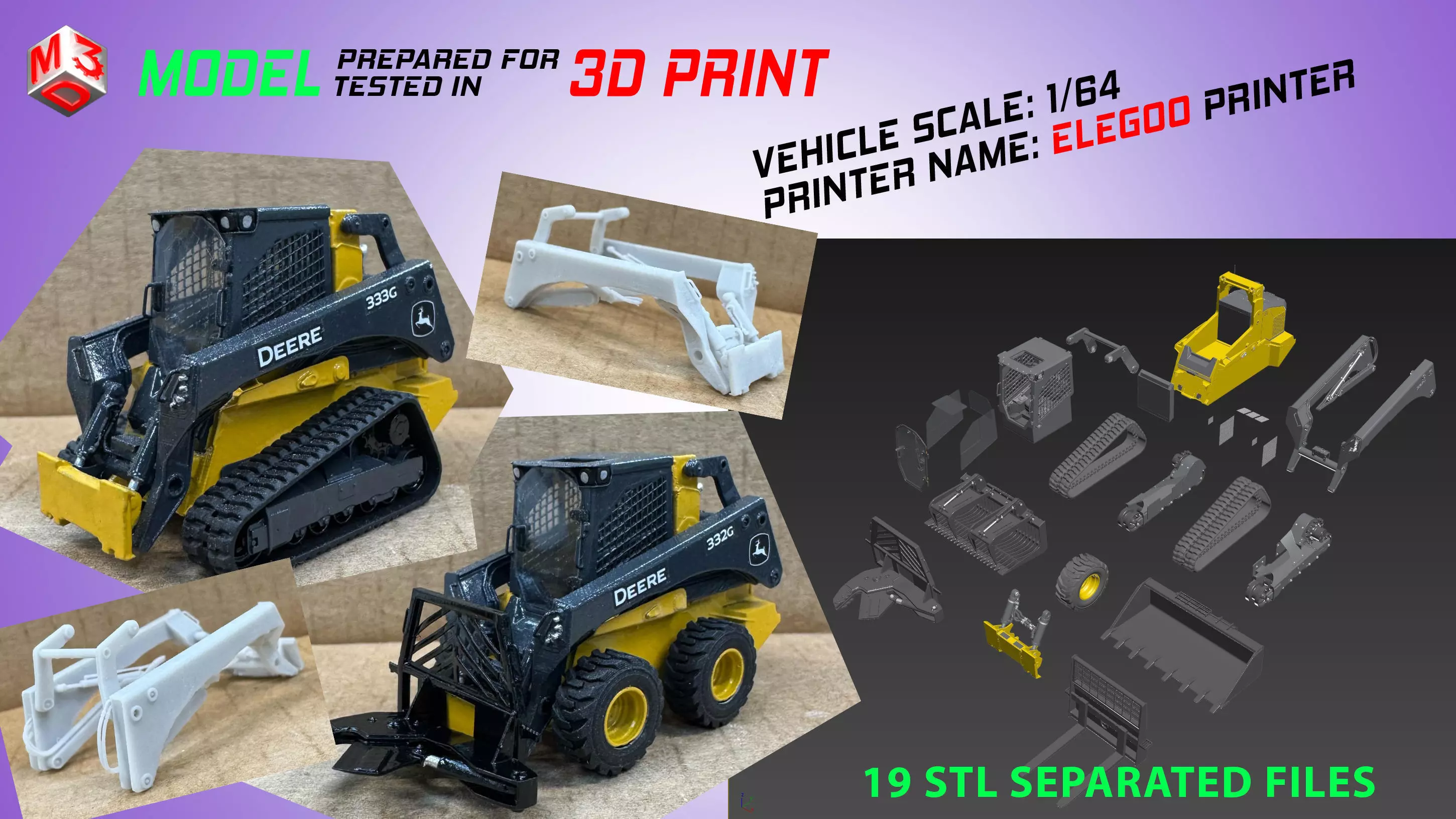Here, you can see our experience in modeling and 3D printing. This model is 1/64 scale and divided into 19 STL files to be easily used in printing.333G Compact Track LoaderReal Print photos are included with this model, so you can check the parts of the model before and after coloring.