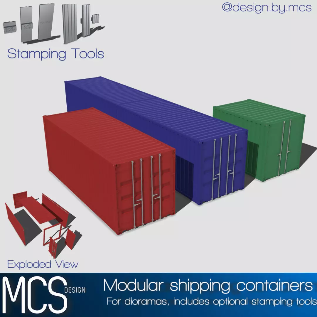 Designed from scratch is a modular shipping container set, high in detail, ideal for scale modeling (currently in 1/24 and 1/25 scale).