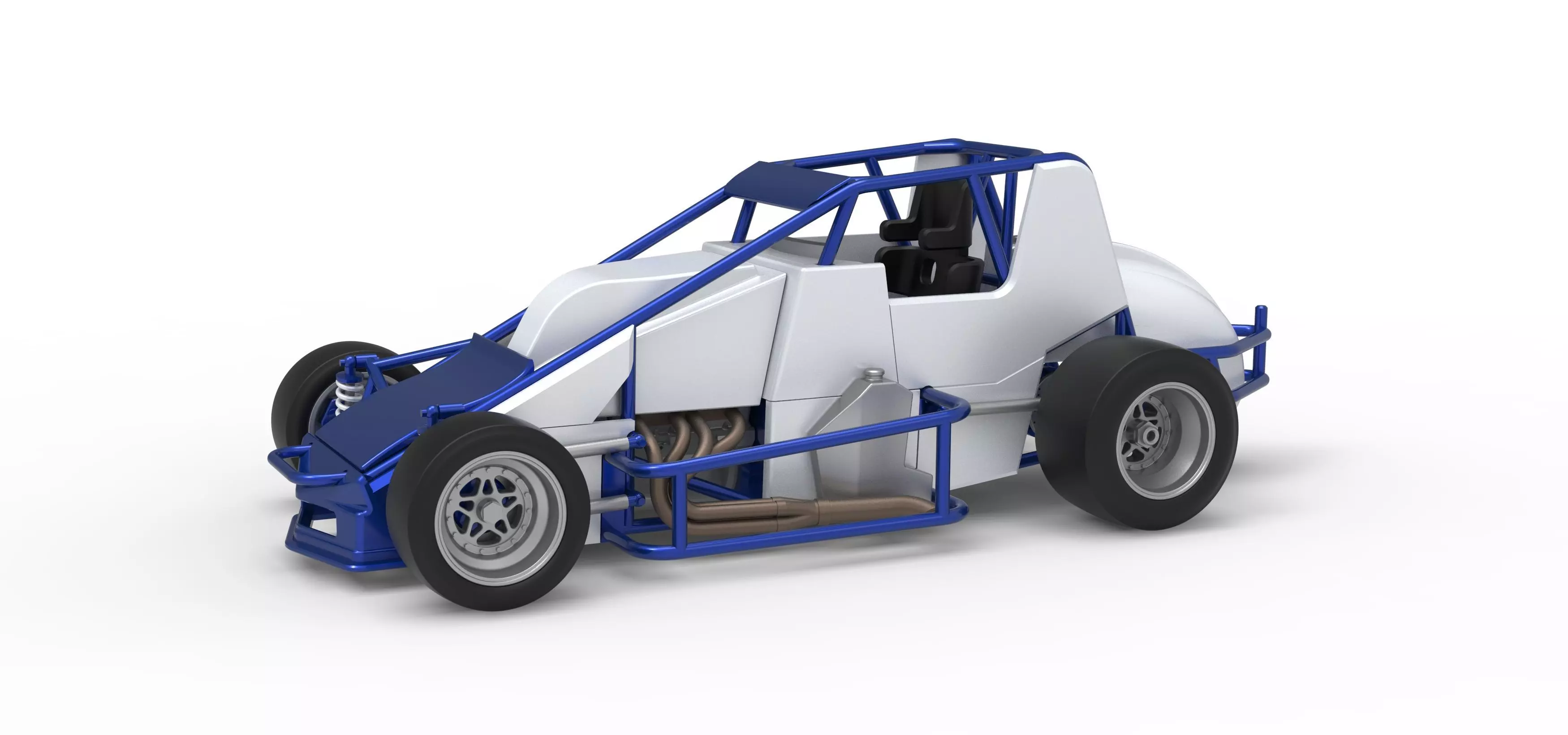 The model consists of parts: Air filter, Air intake, Engine main part, Frame, Front bumper, Front rims, Front tires, Fuel tank bottom plate, Fuel tank insert, Fuel tank, Hood, Left exhaust, Left side part 1-5, Nose part 1,2, Radiator, Rear left rim, Rear left tire, Rear right rim, Rear right tire, Right exhaust, Right side part 1-6, Seat, Shell central part 1,2, Side oil tank, Steering wheel, Visor.