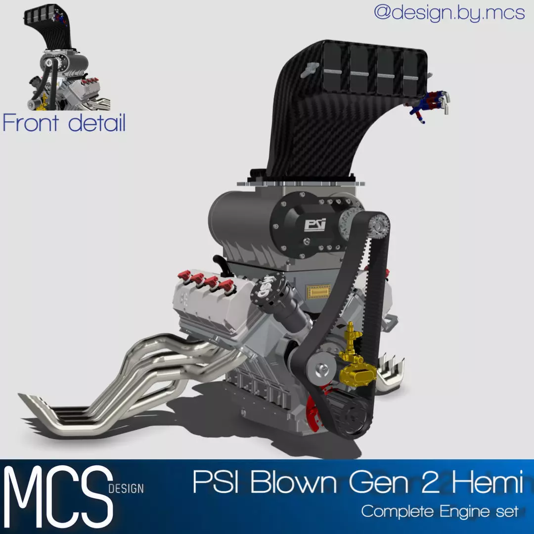 Designed from scratch is a highly detailed PSI Supercharged Promod Hemi, ideal for scale modeling (currently in 1/24 and 1/25 scale).