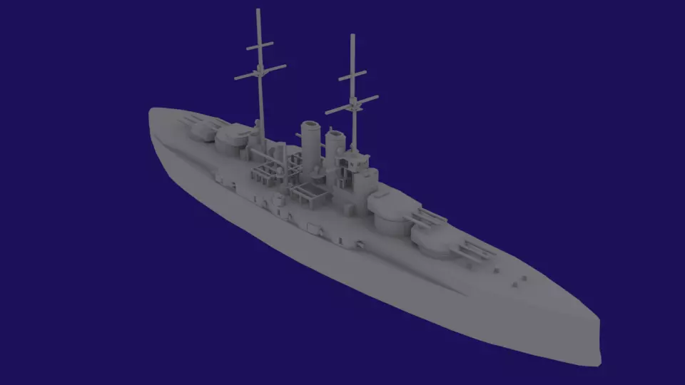 Model is in scale 1:1000. Set contained ship body, 2 mast-pieces, 2 crane-pieces and 4 gun turrets. Was printed on Prusa i3 MK3S with nozzle 0.4 mm, layer 0.1 mm with PLA