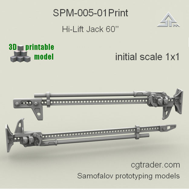 This is 3D printable model can be used for creating scale model miniatures in any scales. Also it can be used by manufacturers of scale miniatures for printing master-models and following replication.Large parts with cavities for savings of printing material.3D model initial scale 1x1.The models in files:spm005prd_HiLiftJack_closed_var1_s1x1_for35_24scalesspm005prd_HiLiftJack_closed_var2_s1x1_for35_24scalesspm005prd_HiLiftJack_open_var1_s1x1_for35_24scalesspm005prd_HiLiftJack_open_var2_s1x1_for35_24scales