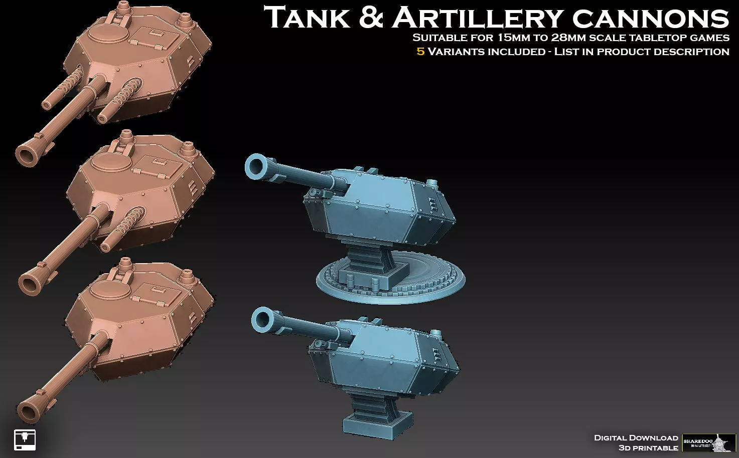A collection of 5 semi-futuristic tank turrets. 3 ordinary turrets, and 2 turrets on a traverse, for modern howitzer-style vehicles. Intended primarily for 28mm tabletop games, but can be printed at both larger and smaller scales. Sub-15mm scale (like Epic-scale 6mm) printing is possible, but not recommended. No post-print assembly is required as all variants prints as one-part.