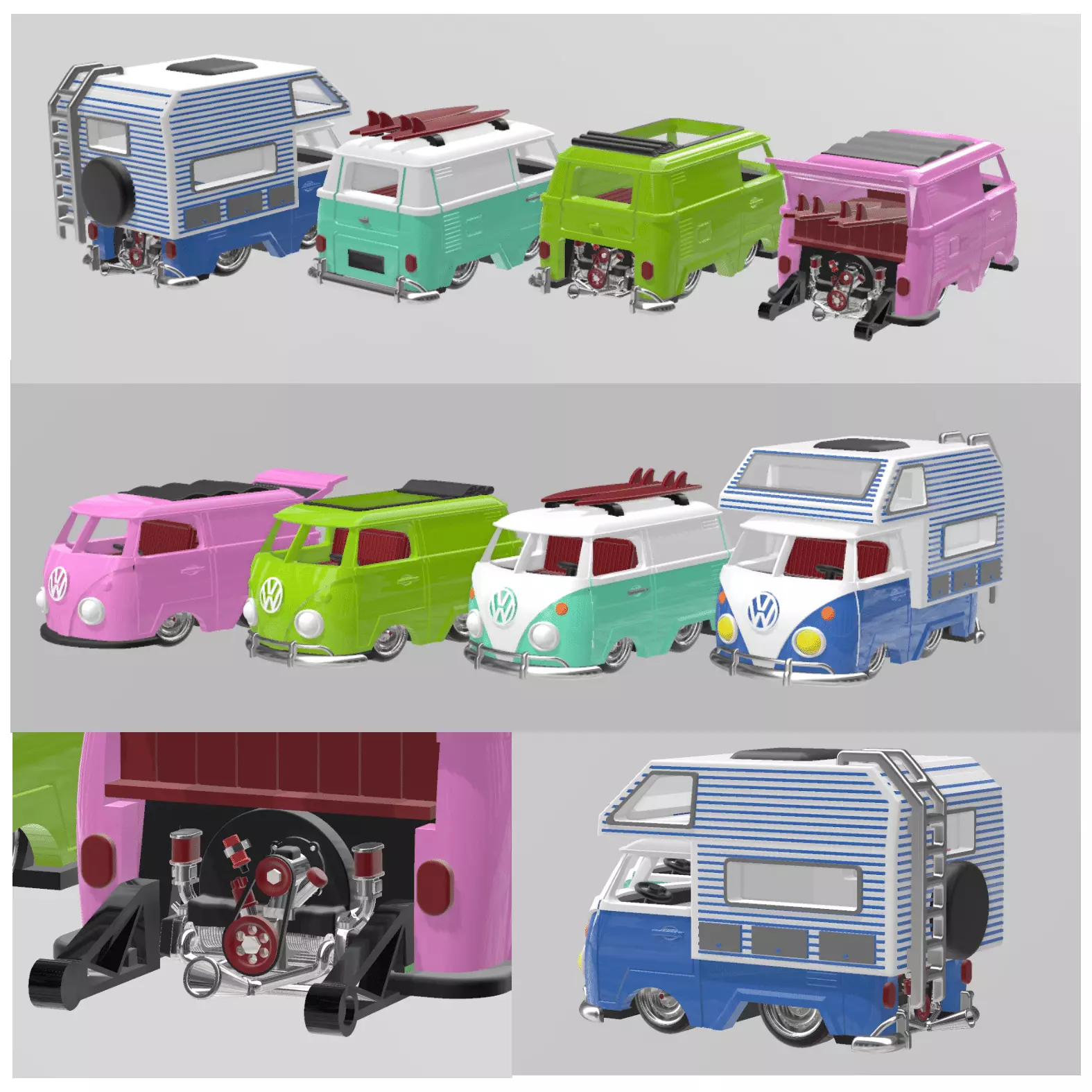 Complete van kit, with 09 different possible models to make!With bonus motor home body.Different sizes front and rear wheels, chassis, interior, steering wheel, body and windshield!Perfect for making as many custom vans you wan't!This took me a long time, worked on 3 different version untill I got to this one.Needs and 0.8 or 1.2mm axle, depending on your printer accuracy, in my experience, printing with 1.2mm holes gave me a perfect fit to a 0.8 hw style pin, so the holes on the wheels and chassis are 1.2mm.Use clear resin for the windshield.Any problem with the files or if you need any help, let me know.Already in 1/64 scale.If you like my designs, you can tip me and credit me with the design.If you like to sell the prints of my designs just buy them here and credit me with the design, no need to ask or pay commisions.I can do commision designs, just ask me what you need and I'll see what I can do.Just scale it up to the size you want and print with you favorite resin printer.If you need any help, don't hesitate on contacting me.Drilling and Sanding may be needed.