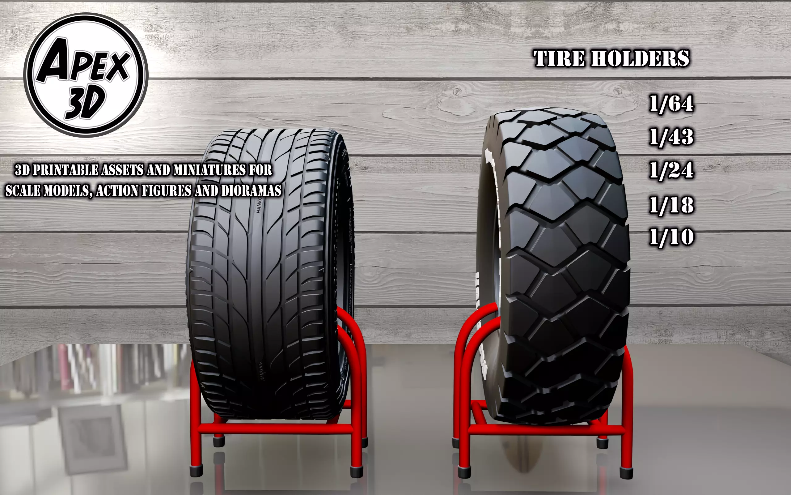 Looking to add some realism to your dioramas, scale models, or action figure displays? Look no further than this 3D printable Tire Holders with Tires! This high-quality replica is available in the scales 1/641/431/241/181/10 making it the perfect addition to any collection.