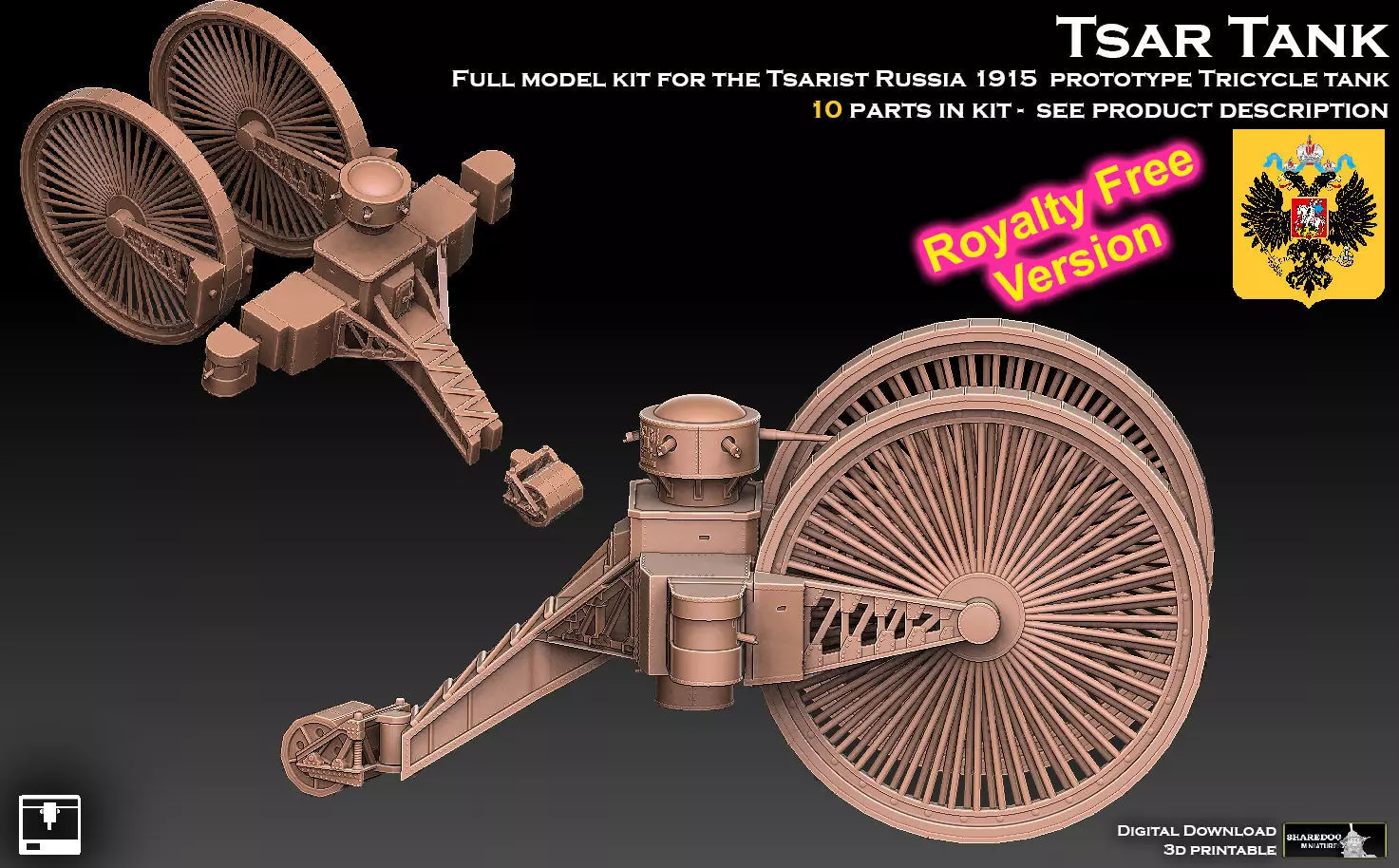This model kit contains 10 individual model parts. You need 9 of them to build a complete Tsar Tank. The tenth model part is an alternate main turret with the imperial Russian coat of arms, and the name Rasputin stamped in cyrillic. This product contains both** .stl** and .obj versions of the models. Note that you can request other file formats as well.The parts require glue for assembly. There is an image in the gallery you can use as guidance for assembling the kit, though you'll probably be able to figure it out on your own. The rear wheel, main turret and sponson guns can be turned in different directions, though you still need to glue them in place once you've decided on a direction.A detailed model parts list follows below: