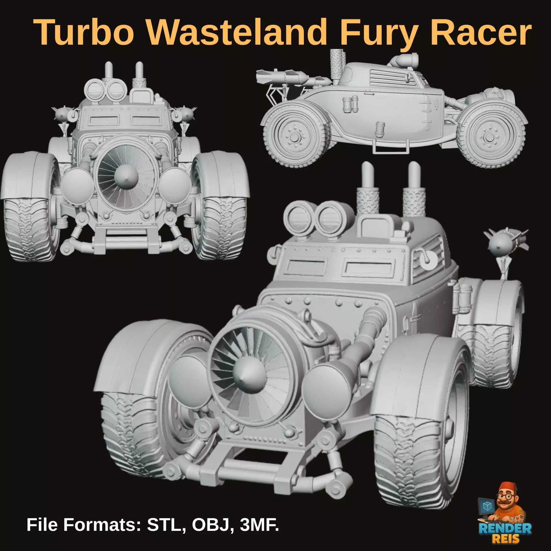Turbo Wasteland Fury Racer combines atomic age dieselpunk aesthetics with high speed combat design. The massive front turbine engine, riveted armor plating and rear missile system transform the vehicle into a true wasteland war machine.