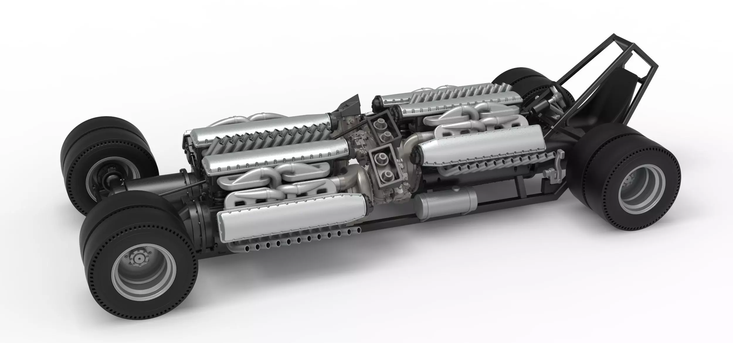 The model consists of parts: Air intakes, Brake pedal, Engine bodys, Engine compressors, Engine head covers, Frame, Front right engine body, Left exhaust pipes, Rear left engine body, Right exhaust pipes, Rims, Scoops, Seat, Shifter, Spacers, Steering wheel, Tanks, Tires.