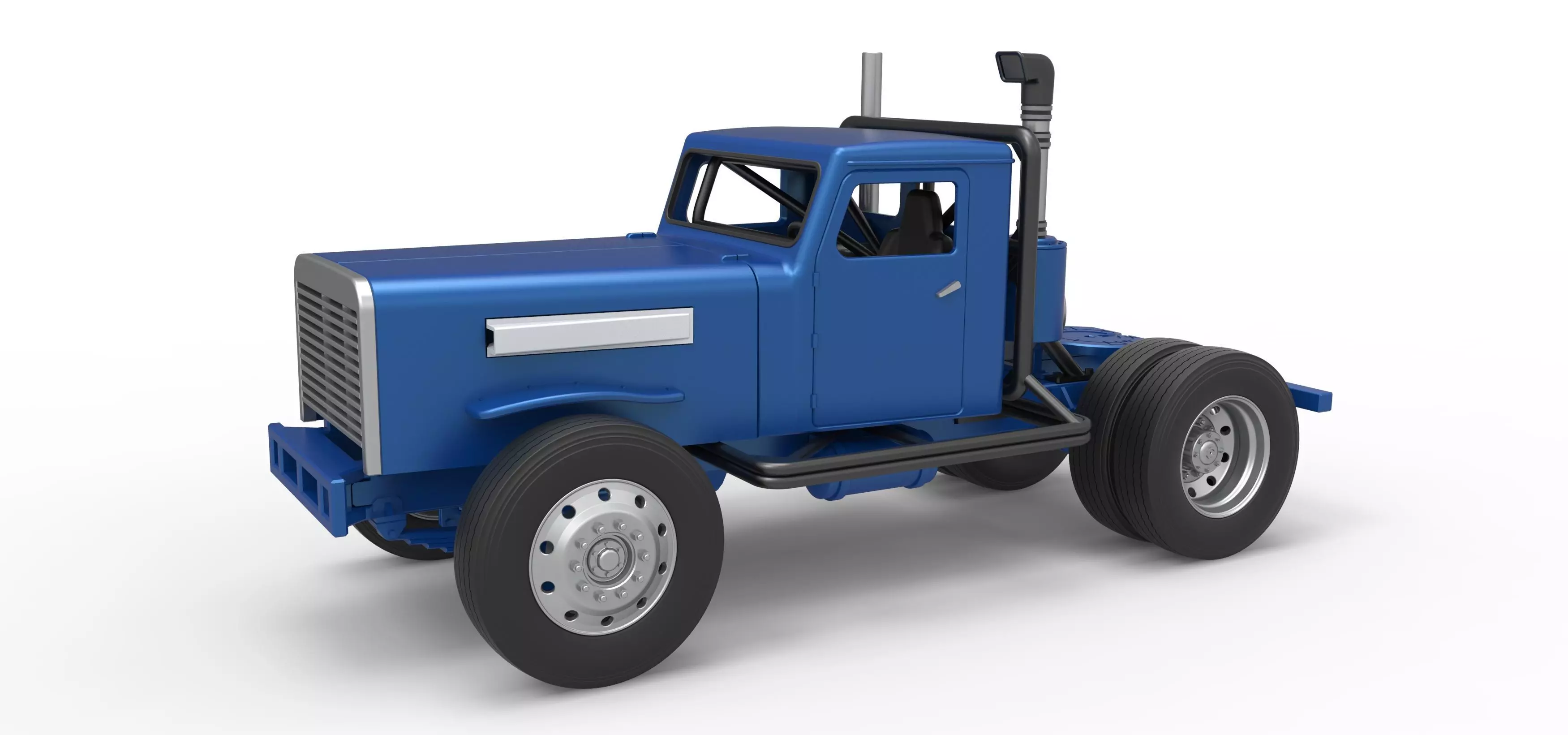The model consists of parts: Air filter, Air scoop, Air tube 1-3, Body, Cab, Compressor part 1,2, Engine main part, Exhaust part 1,2, Exhaust pipe part 1,2, Fifth wheel, Front bumper, Front grid, Front rims, Fuel tank cap, Fuel tank central part, Fuel tank mounts, Fuel tank side parts, Hood, Inner frame, Outer frame spacers, Outer frame, Radiator, Rear bumper, Rear inner rims, Rear outer rims, Seat, Shifter, Side scoops, Side tank, Steering wheel, Tires.