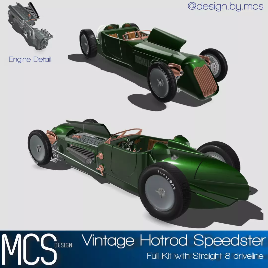 The design is modeled around the dimensions of an 1928 Ford, with inspirations from dirt racers, land speed racers, and luxury sports cars of the 1910s & 1920s, now as a full detail 3D printable model, ideal for scale modeling (currently in 1/24 and 1/25 scale).