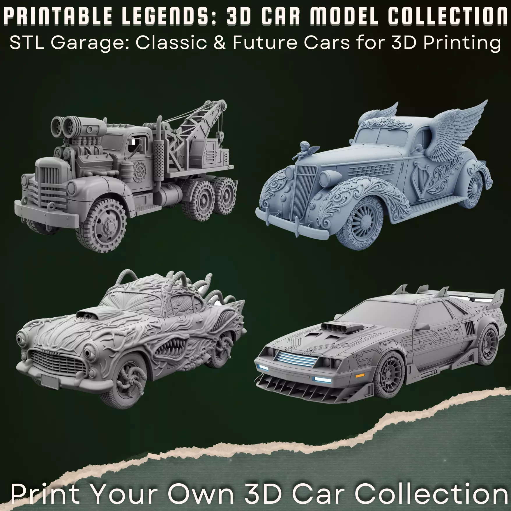Welcome to a realm where post-apocalyptic chaos meets gothic horror and vintage engineering!The WASTELAND MACHINES & GOTHIC NIGHTMARE CLASSICS collection fuses 1930s–50s automotive charm with elements of fantasy, horror, and retro-futuristic warfare. Each vehicle is sculpted as a single, waterproof, and fully printable mesh — ideal for dioramas, tabletop setups, or eerie displays. Included Models: