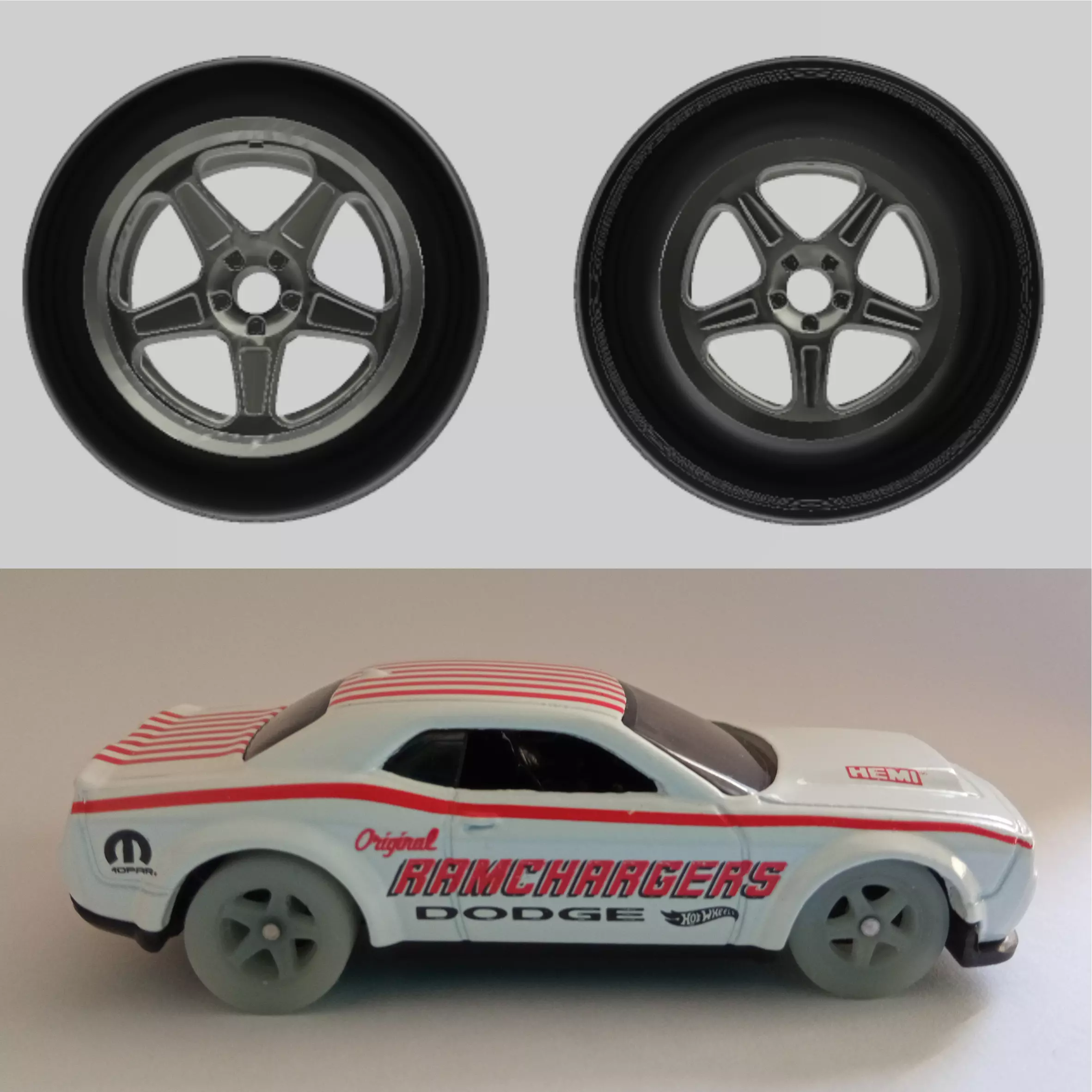 Front and Rear Dodge Demon Wheels and Tires!The front are thin tires with a smaller wheel, and the rear is a drag radial just like the original one,There are 2 versions, full wheel and tire, and wheel and tire separately. You can use the skinny tires on the front, or use the same ones as in the rear, like the street version of the car.You can reuse the original hot wheels axle, but you'll probably need a new pair for the other side, depending on how you install them, you can only cut the wheel wires and change the wheels, but you'll need a second pair of axles. If you drill the rivets, you can reuse the same axle.If you like my designs, you can tip me and credit me with the design.If you like to sell the prints of my designs just buy them here and credit me with the design, no need to ask or pay commisions.I can do commision designs, just ask me what you need and I'll see what I can do.Just scale it up to the size you want and print with you favorite resin printer.If you need any help, don't hesitate on contacting me.Drilling and Sanding may be needed.