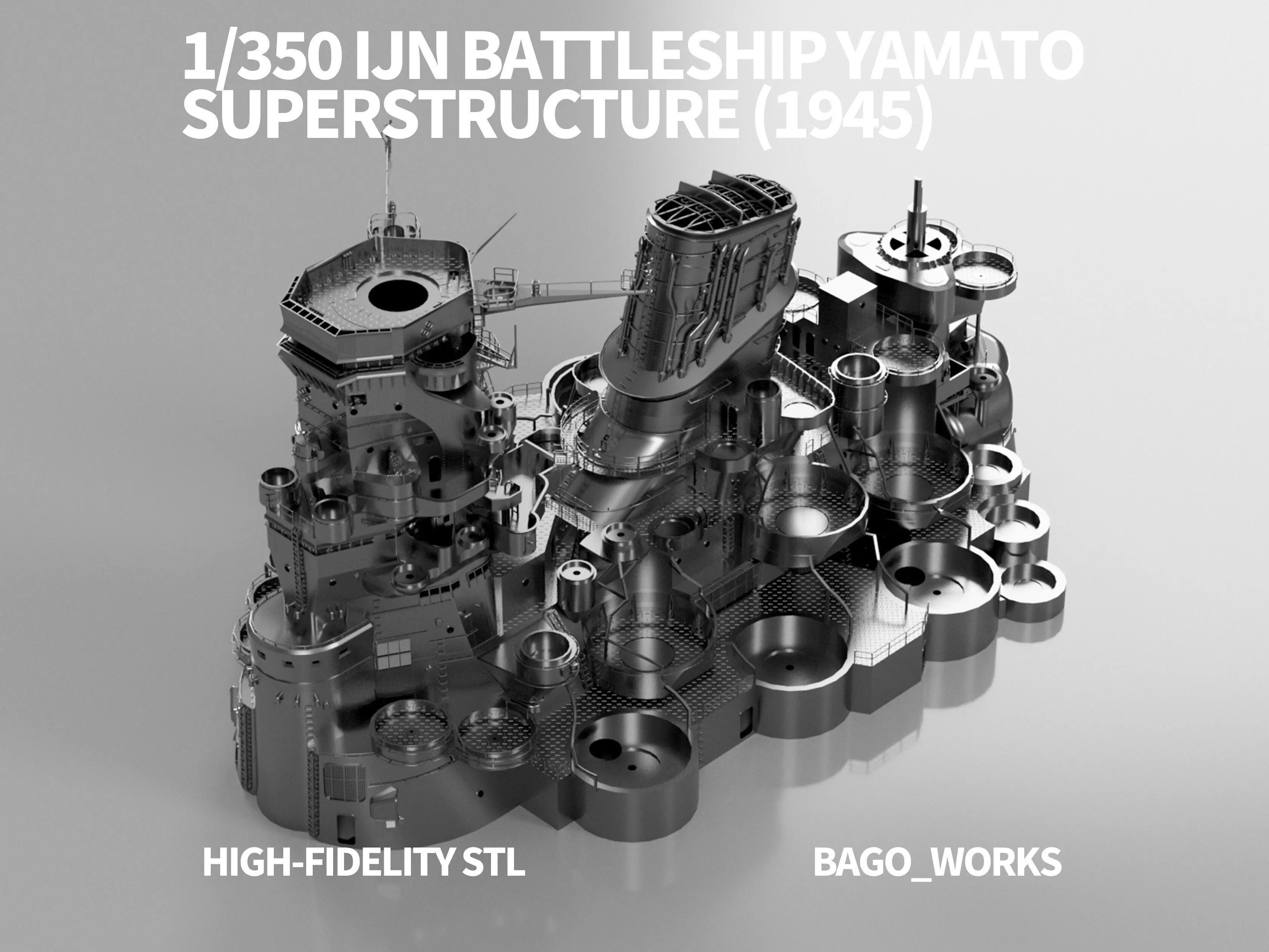 A massive, highly detailed 3D model of the Central Superstructure for the 1/350 Battleship Yamato, representing its final 1945 configuration.This set encompasses the entire central section, including the Main Bridge and Aft Bridge.Designed by a professional mechanical engineer, this model is intended to replace the superstructure of the Tamiya Premium Yamato kit (New Tooling).
