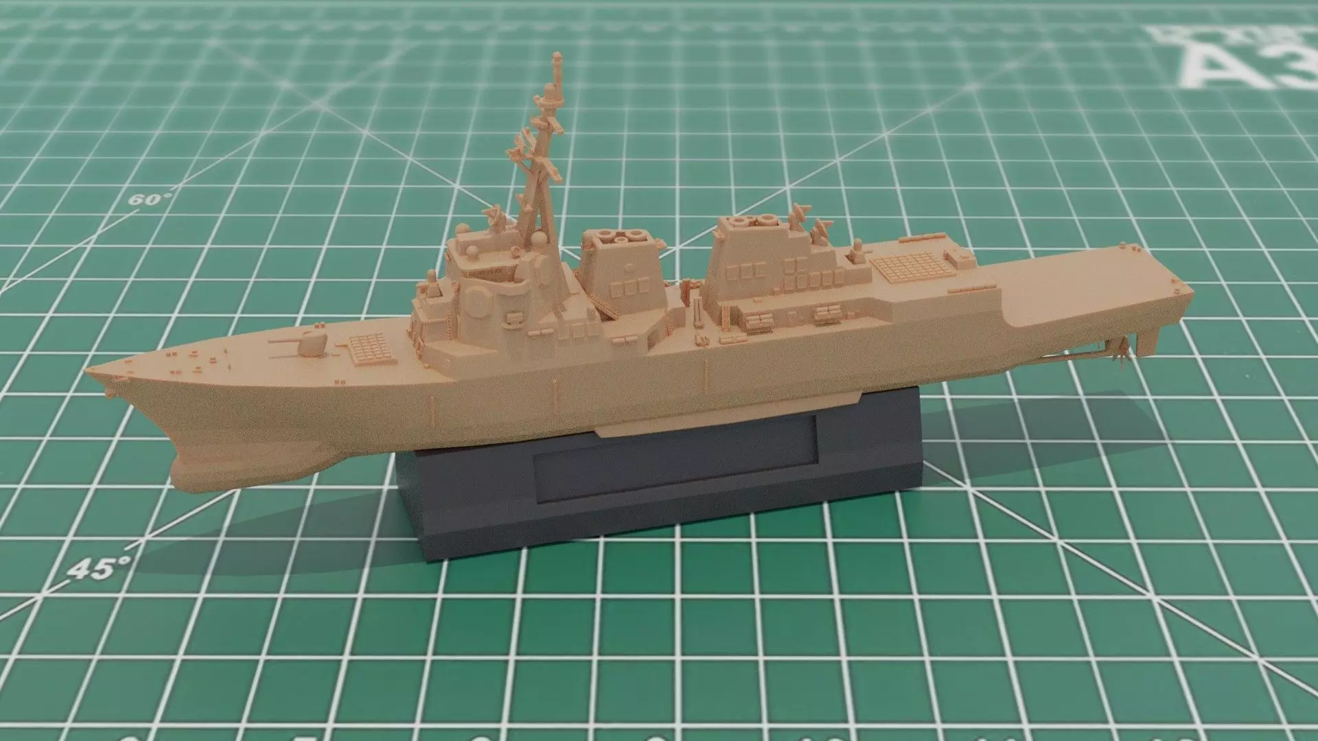 Arleigh Burke Class Naval Destroyer 3D Print Model. Built at 1:1250 scale. Model is shown painted in some illustrations. Model is supplied unpainted. Split into four parts for ease of printing; Above Waterline, Below Waterline, Fixing Lug and Stand. Approx 12cm long when printed.