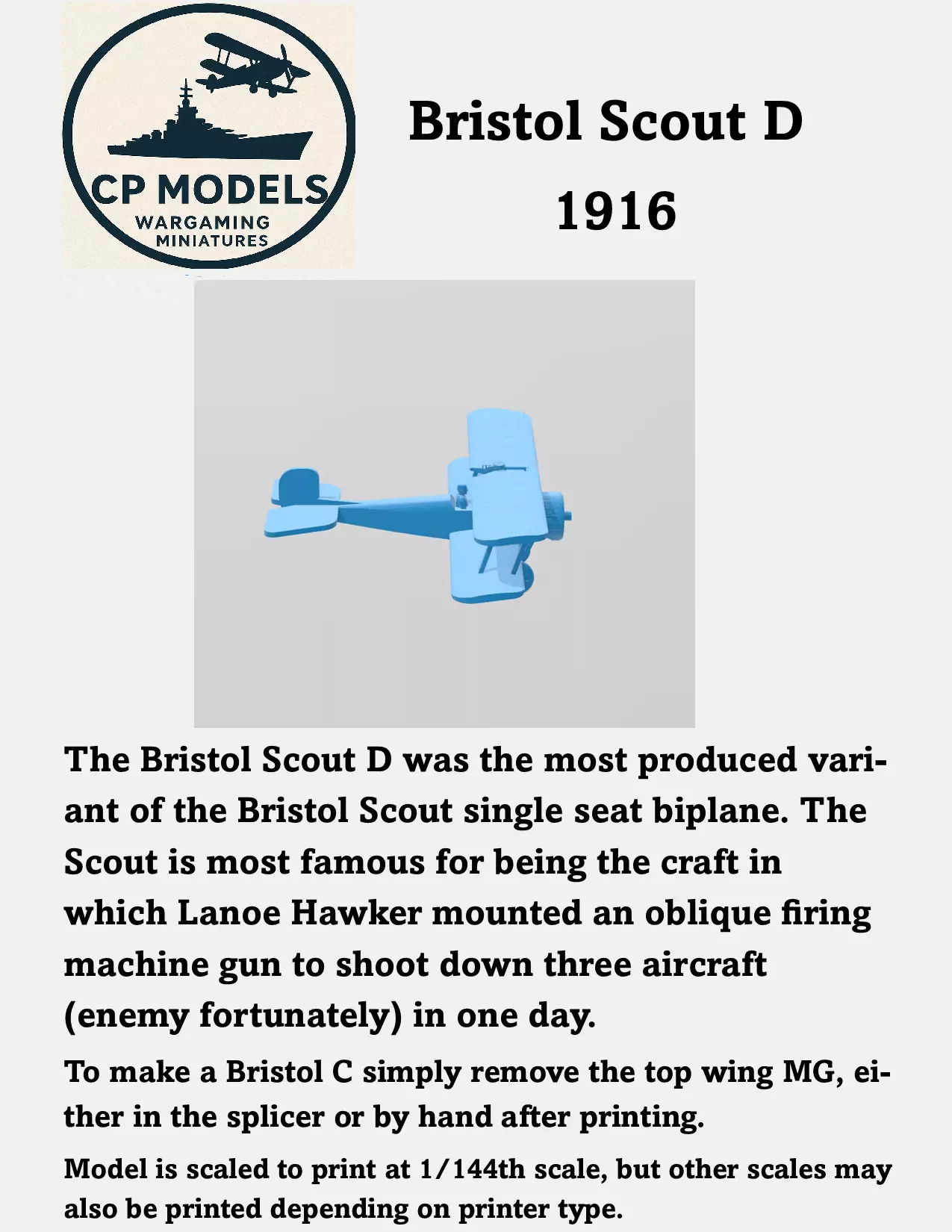 The Bristol Scout D made its appearance over the Western Front in 1916, and was the most produced variant of the aircraft. Though it was soon superceded by more capable aircraft, the Scout served a useful purpose early in the war and the C variant was made famous by the RFC's Lanoe Hawker, who in 1915 mounted an oblique firing Lewis gun to the port side and use it to down three aircraft, fortunately all enemy, in one day. Such a feat that early in the war resulted in Hawker getting a Victoria Cross and command of his own squadron. To make a C variant, simply snip off the top wing mounted Lewis gun, or remove it in your slicer prior to printing.