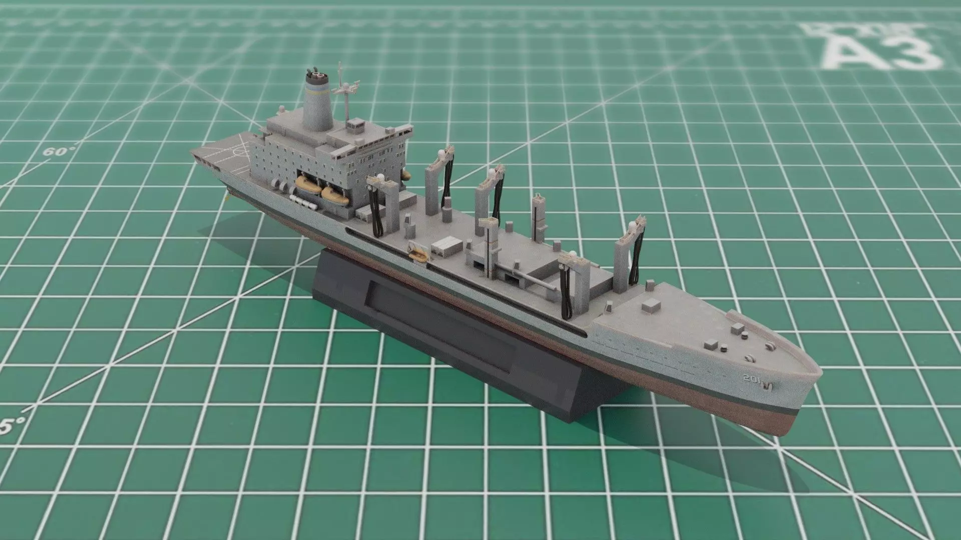Henry J Kaiser Class Replenishment Oiler of the US Navy. For a commercial license to sell hard copies of this model please get in touch. STLs/3MF files are ready to print at 1:1250 scale (approx 17cm long). Model may be shown painted in some illustrations. Model is supplied unpainted. Ship is split at waterline, with optional stand, offering several build options (wargame or display model)