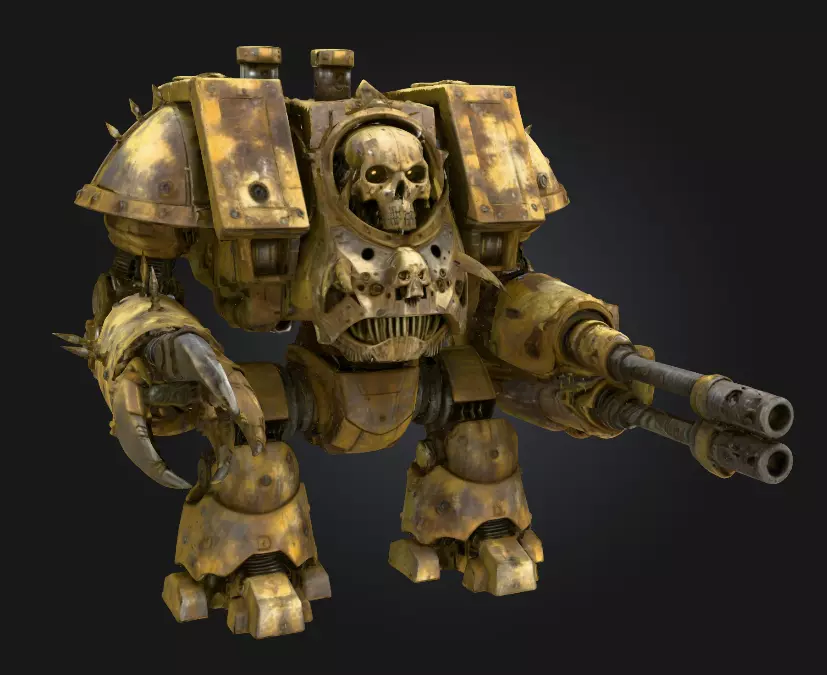 This hulking war machine embodies the rotting grandeur of the Plague God. Its armored shell is corroded and scarred, covered with pustules, rust, and dripping filth, as if the metal itself is alive with decay yet refuses to break. A baroque skull relief marks the front plating, while beneath it a grotesque skeletal visage peers out—an eternal reminder of the damned soul entombed within this walking sarcophagus.