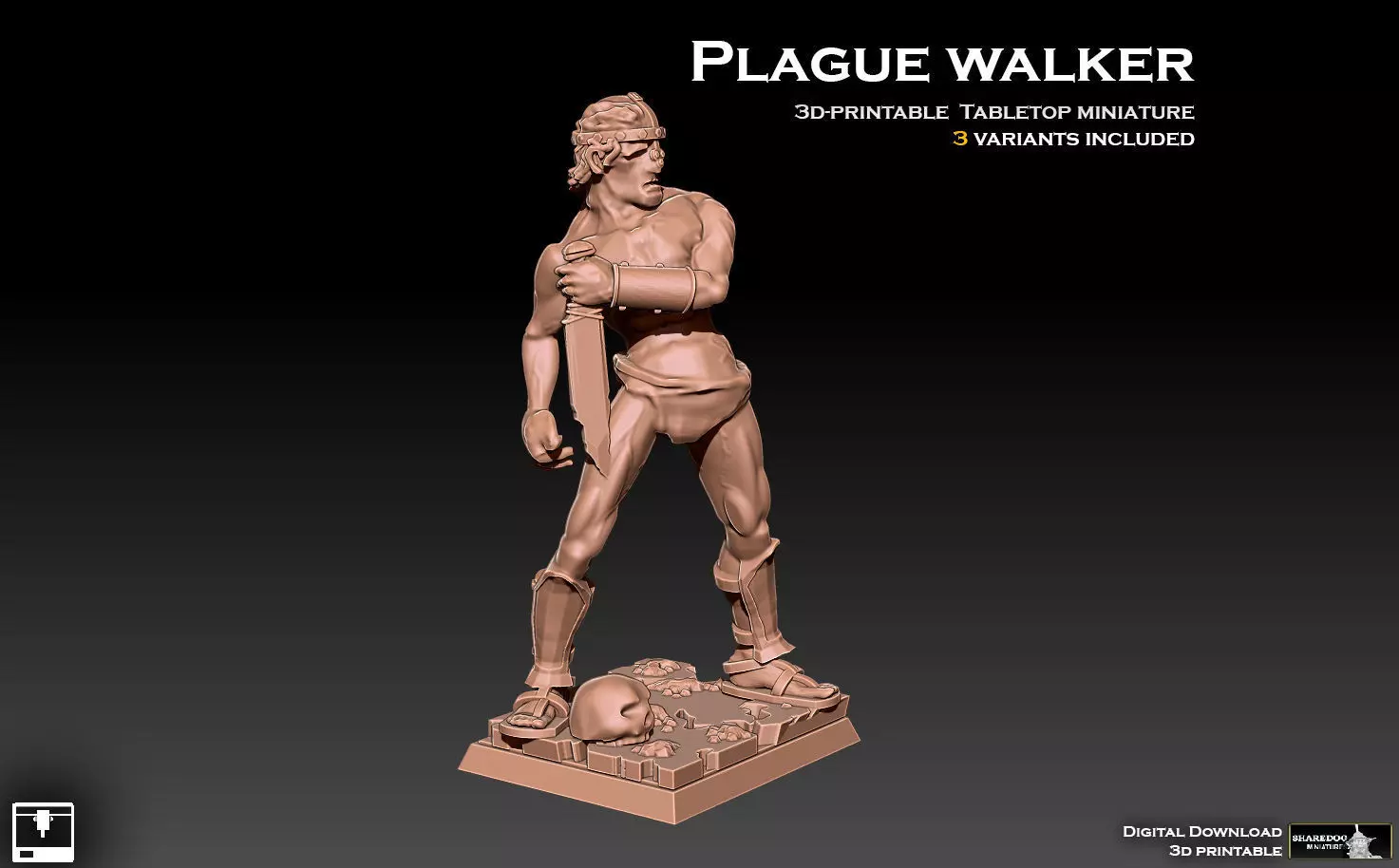 Afflicted fanatic, armed with makeshift sword. Around its neck is a wooden sign, on which you can (for example) write the name of the disease that afflicts the warrior. This miniature is suitable as a low-level warrior is any religious or chaos-themed tabletop miniature army, or a post-apocalyptic setting, or as a shambling zombie. Recommended scale is 28mm, which is also the default scale of the models when uploaded to your slicer. Size can be altered freely by you prior to printing, though sub-20mm scale is not recommended. This model pack includes three versions of the Plague Walker: One balding warrior, one warrior with a full head of hair, and one version with a sign hung around its neck on which you can, for example, write the name of the disease that plagues the warrior. There is also a rectangular base included.