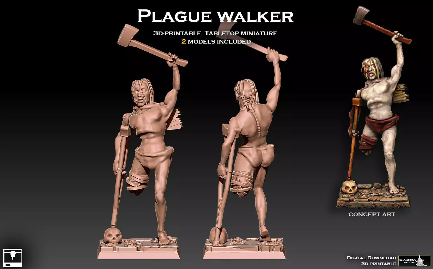 Afflicted fanatic, limping along on a crutch while wielding an axe.This miniature is suitable as a low-level warrior is any religious or chaos-themed tabletop miniature army, or as a casualty of war, or a shambling zombie. Recommended scale is 28mm, which is also the default scale of the models when uploaded to your slicer. Size can be altered freely by you prior to printing, though sub-20mm scale is not recommended. This model pack includes two versions of the Plague Walker: one version with a sign hung around its neck (on which you can, for example, write the name of the disease that plagues him), and one version without the sign. There is also a rectangular base included.