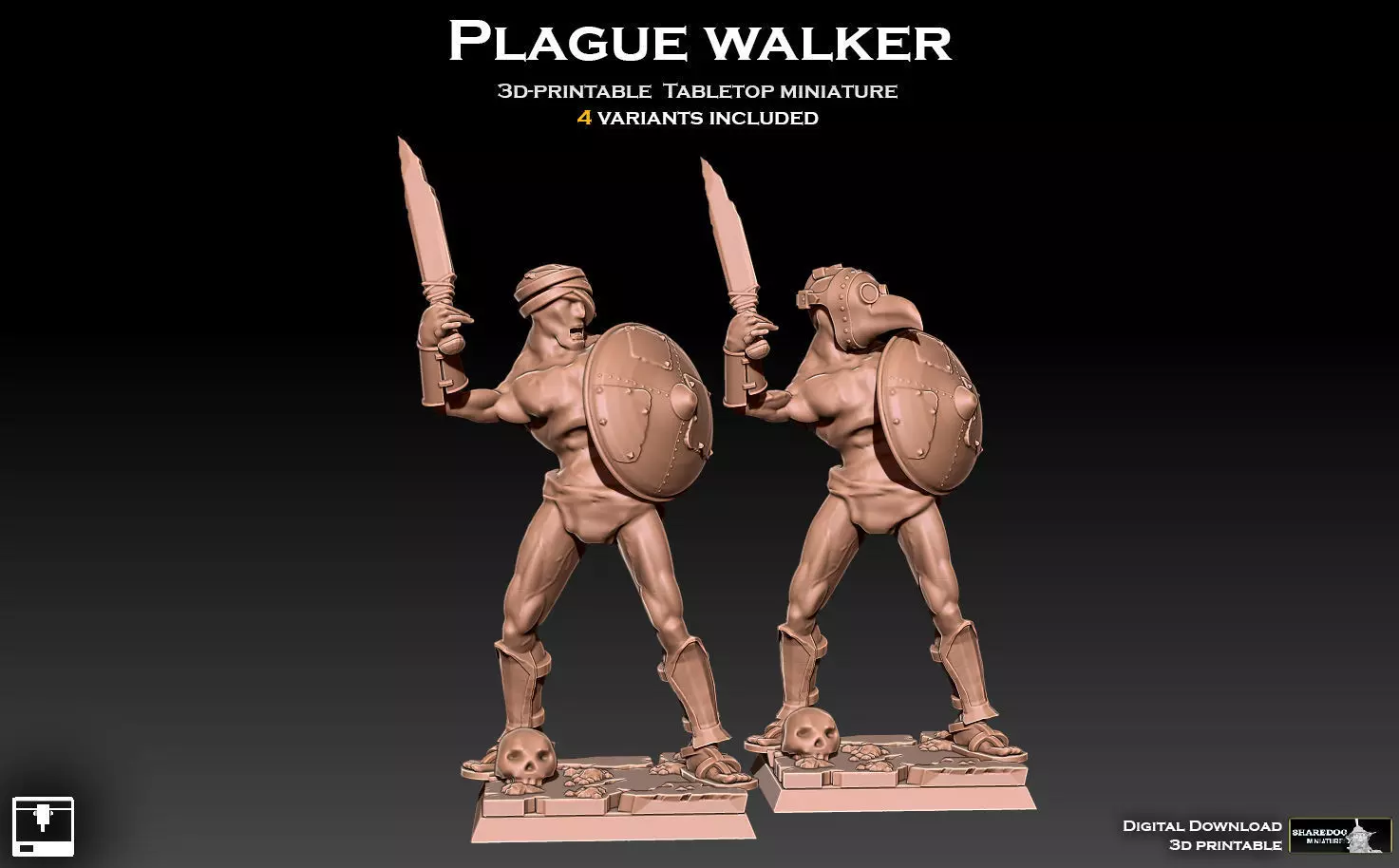 Afflicted fanatic, armed with primitive sword. Around its neck is a wooden sign, on which you can (for example) write the name of the disease that afflicts the warrior. This miniature is suitable as a low-level warrior is any religious, chaos or undead-themed tabletop miniature army, or a post-apocalyptic setting. Recommended scale is 28mm, which is also the default scale of the models when uploaded to your slicer. Size can be altered freely by you prior to printing, though sub-20mm scale is not recommended. This model pack includes four versions of the Plague Walker: one wearing a plague doctor's mask, and one with bandaged head. There are also versions of the two with a sign hung around their necks, on which you can, for example, write the name of the disease that plagues the warrior. There is also a rectangular base included.