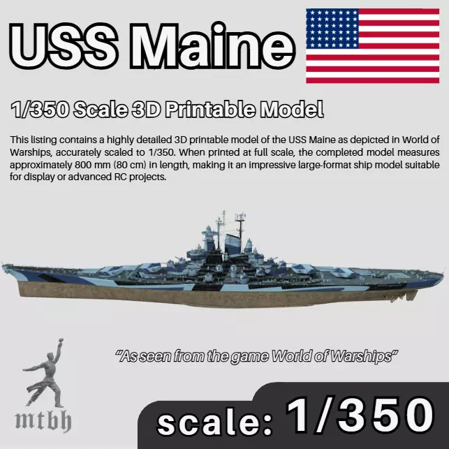 This listing contains a highly detailed 3D printable model of the USS Maine as depicted in World of Warships, accurately scaled to 1/350. When printed at full scale, the completed model measures approximately 800 mm (80 cm) in length, making it an impressive large-format ship model suitable for display or advanced RC projects.