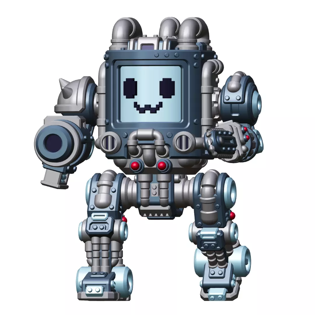 Meet Killjoy, the delightfully deadly member of the UWU Shadow Force! This chunky, pixel-faced mech packs a chainsaw arm, heavy plating, and a smiling screen that’s way too cheerful for the battlefield. Designed for 32 mm tabletop wargames, this mech brings a mix of cute and chaotic energy to any sci-fi skirmish or miniature collection.