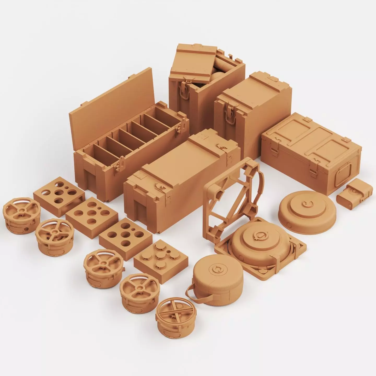 Wooden box for M6 antitank mines and container for fuze and activator. 1 box can hold 2 mines, 2 containers, and two wooden support planks.2 versions of the crate: separate, closed (solid)