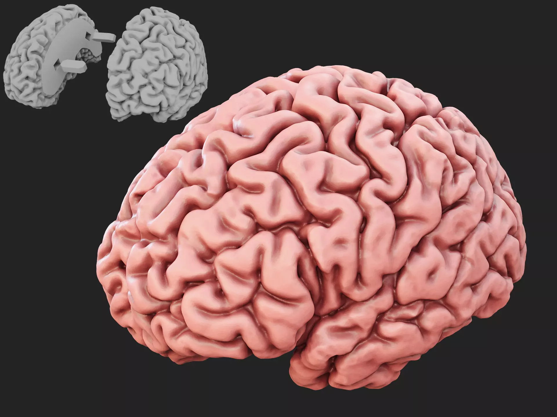 3D printable model of actual size adult human brain. The model is split in two parts for easier print. Due to complexity of the model's shape, the supports are must for successful print.