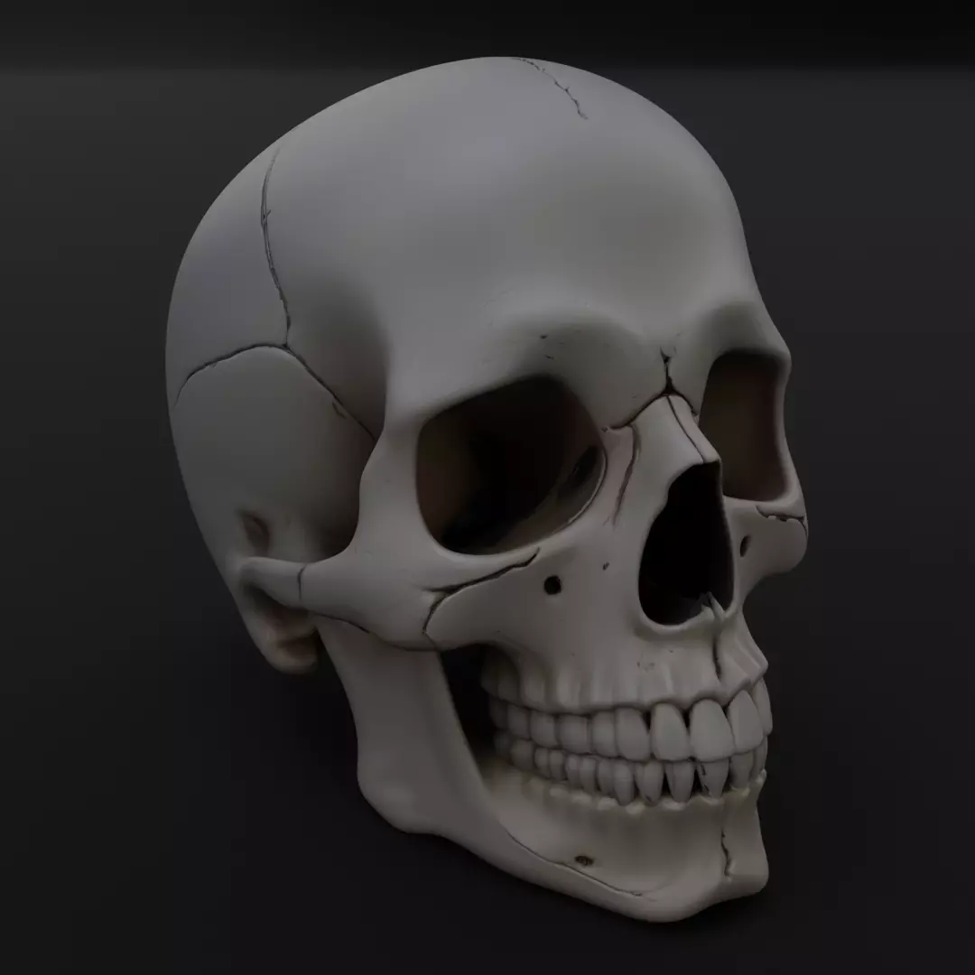 Special attention has been given to print-friendly geometry. The mesh is fully watertight, manifold, and free from errors such as holes, flipped normals, or intersecting faces. All surfaces are optimized to ensure smooth layer transitions and clean results on both FDM and resin 3D printers. Fine details such as teeth, jawline, eye sockets, nasal cavity, and cranial sutures are carefully balanced to remain visible after printing without causing fragile or unprintable areas.