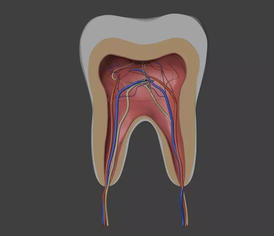 This 3D dental model of teeth provides a highly detailed and anatomically accurate representation of human dental anatomy. It features a complete set of teeth, including incisors, canines, premolars, and molars, along with realistic details of crowns, roots, and enamel surfaces.