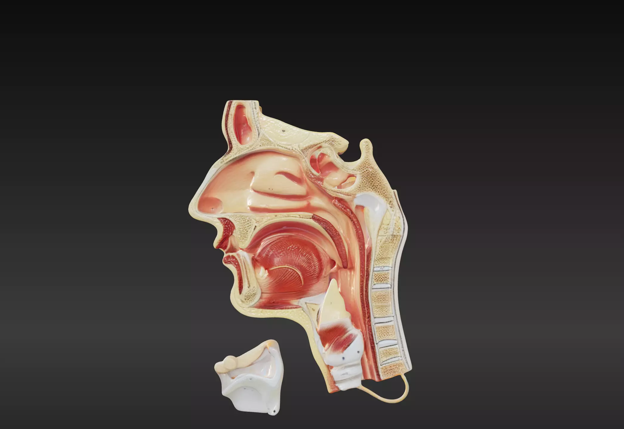 This 3D model of the cavities of the nose, mouth, and throat provides a highly detailed and anatomically accurate representation of the interconnected structures of the upper respiratory and digestive tracts. It highlights key features, including the nasal cavity, oral cavity, pharynx (nasopharynx, oropharynx, and laryngopharynx), soft palate, uvula, and the openings to the esophagus and trachea.