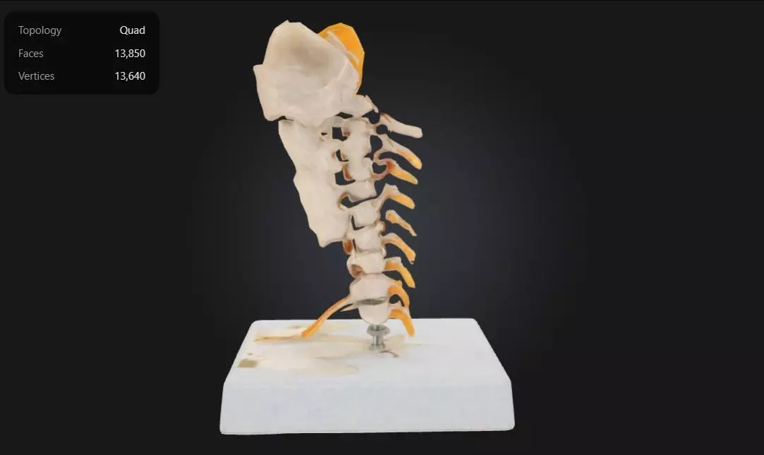 This 3D model of the cervical vertebral column provides a highly detailed and anatomically accurate representation of the upper section of the human spine. It highlights the seven cervical vertebrae, including their unique features such as the transverse foramina and bifid spinous processes, which distinguish them from other regions of the vertebral column. The model effectively demonstrates the structure and function of the cervical spine, including its role in supporting the skull, enabling head movement, and protecting the spinal cord.