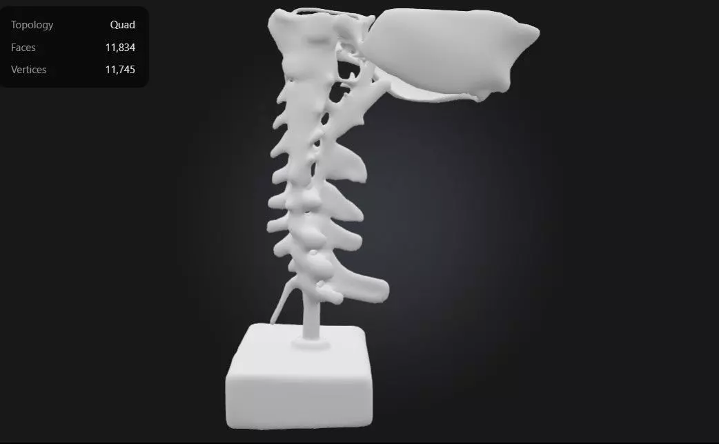 This 3D model of the cervical vertebral column with spinal nerves and arteries provides a highly detailed and anatomically accurate representation of the upper portion of the human spine. It highlights the cervical vertebrae, including their unique structural features, along with spinal nerves and major arteries, such as the vertebral arteries, that pass through the transverse foramina. The model effectively illustrates the relationship between the bones, nerves, and blood vessels, offering insights into cervical spine anatomy and function.