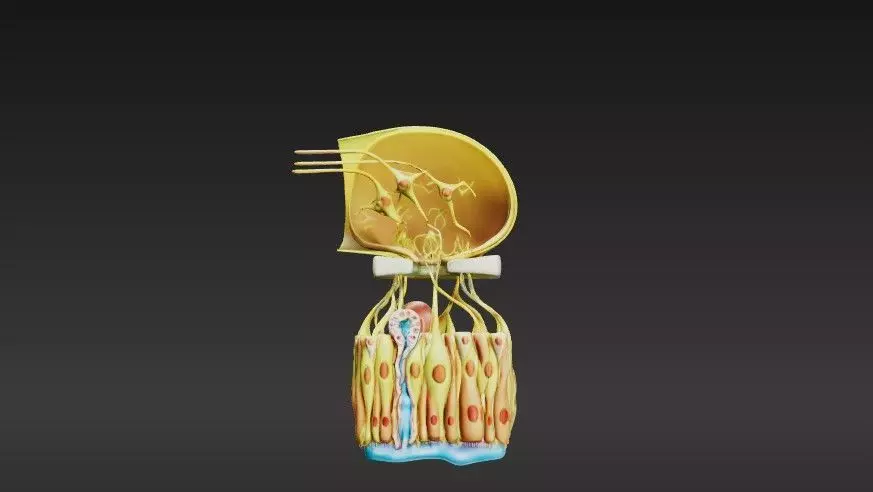 This 3D model of the olfactory epithelium provides a highly detailed and anatomically accurate representation of the microscopic structure responsible for the sense of smell. It is an essential tool for educational, research, and artistic applications, offering a vivid visualization of this complex sensory tissue.