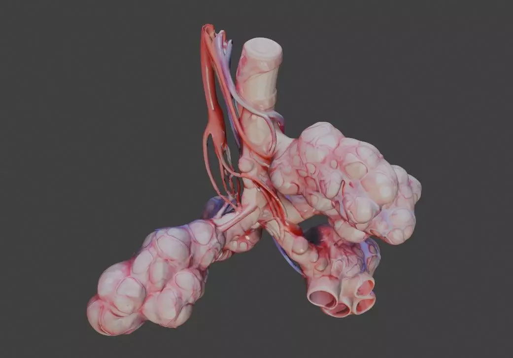 This 3D model of the human bronchi and alveoli anatomy is a highly detailed and anatomically accurate representation of the lower respiratory tract. It provides an in-depth view of the branching bronchi and the microscopic alveoli, essential for gas exchange, making it a valuable resource for educational, medical, and research purposes.
