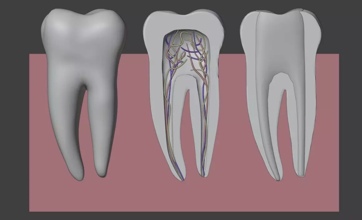 This 3D model of second molar anatomy provides a highly detailed and anatomically accurate representation of the structure and function of a human molar tooth. It highlights key features, including the enamel, dentin, pulp chamber, root canals, and cusps, offering a clear visualization of both internal and external anatomy. The model also showcases the molar’s broad, flat surface designed for grinding and chewing food, along with its strong root structure for stability and support within the jaw.