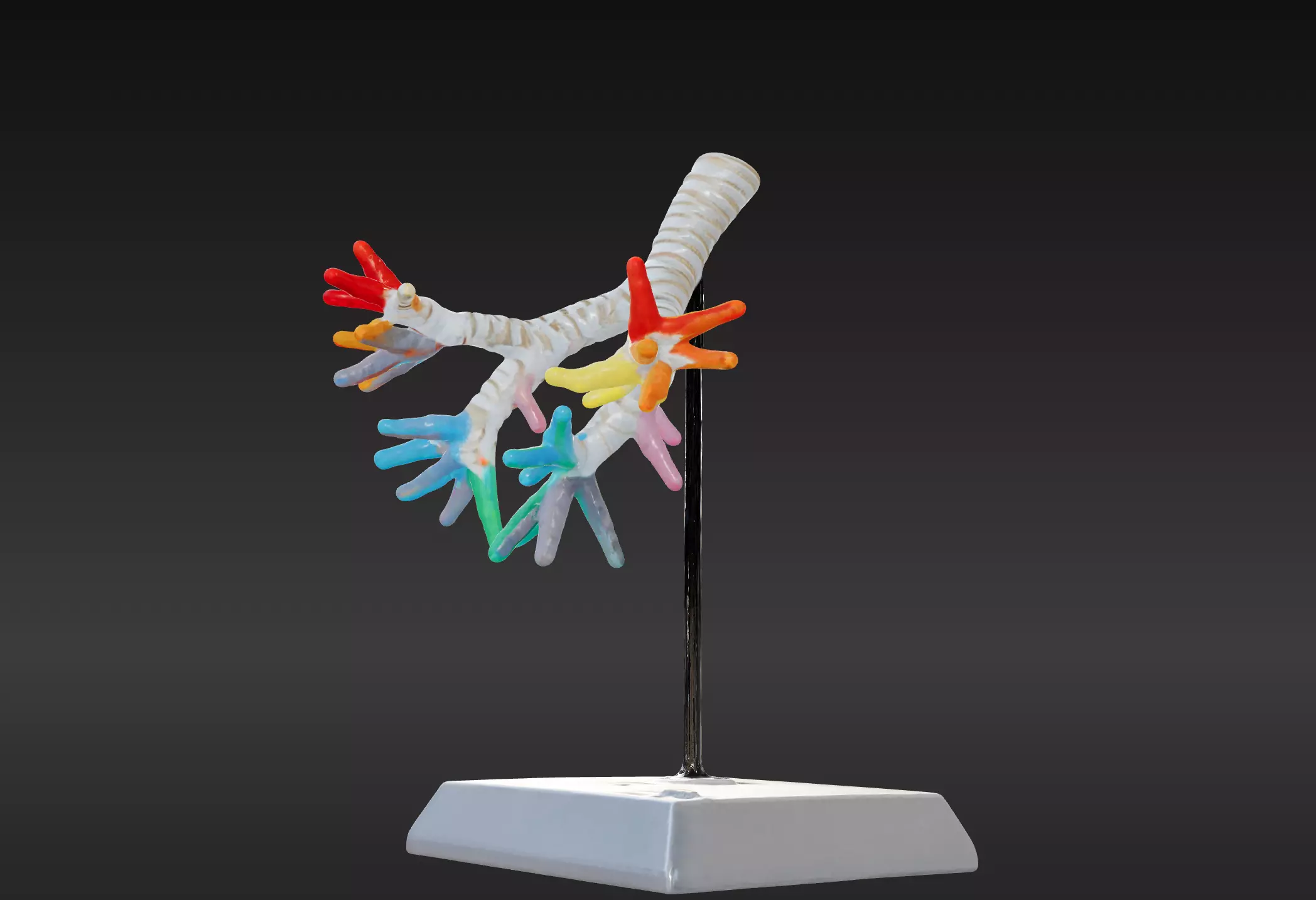 This 3D model of the trachea and bronchi provides a highly detailed and anatomically accurate representation of the human airway system. It highlights the trachea's structure, including its cartilaginous rings and smooth muscle, and demonstrates its division into the primary bronchi, which branch into the secondary and tertiary bronchi. The model effectively illustrates the hierarchical structure of the bronchial tree and its role in directing airflow to the lungs.