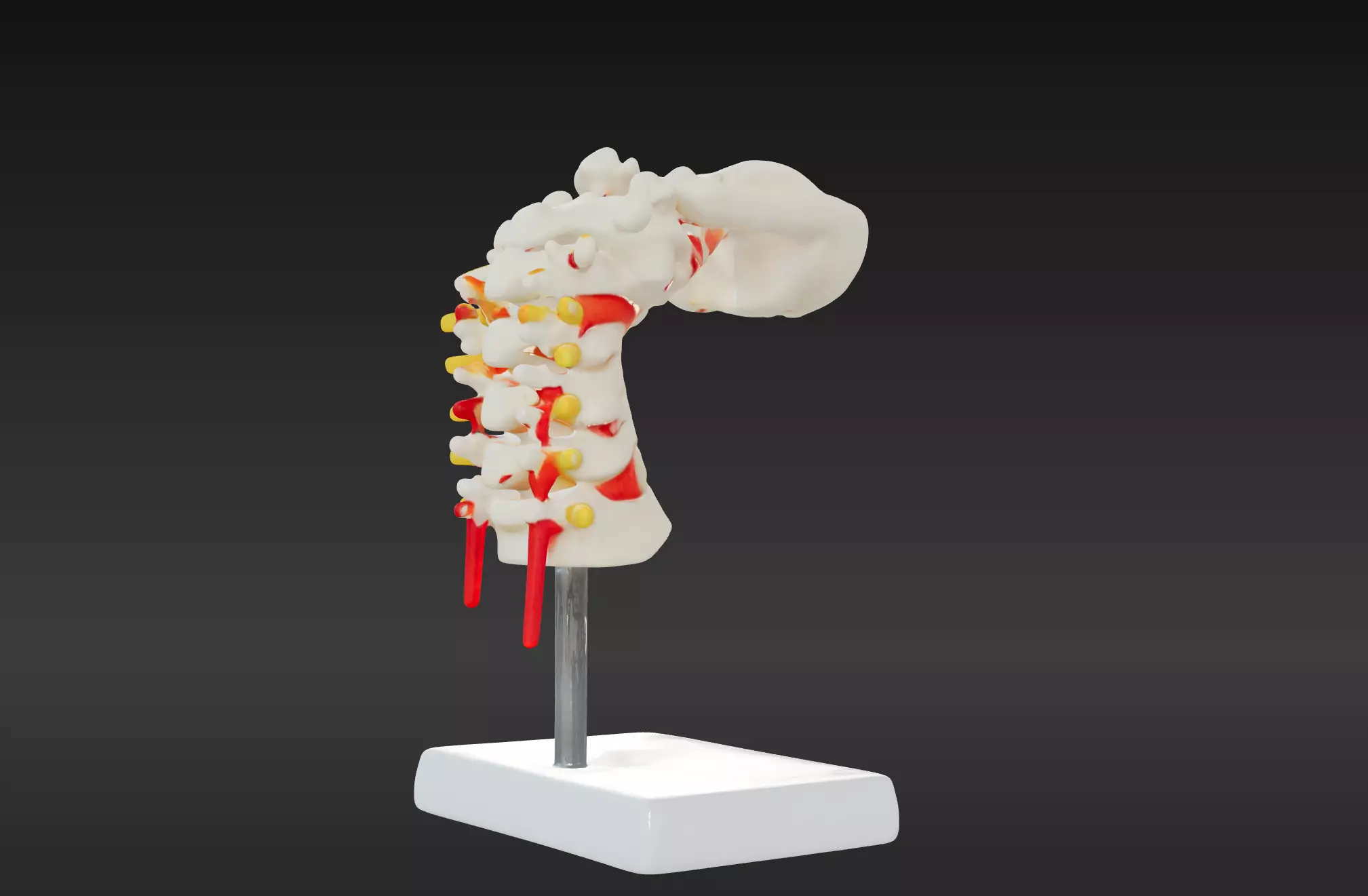 This 3D vertebrae anatomy model with stand provides a detailed and anatomically accurate representation of the vertebral column. It highlights key features of individual vertebrae, including the vertebral body, spinous and transverse processes, and vertebral foramen.