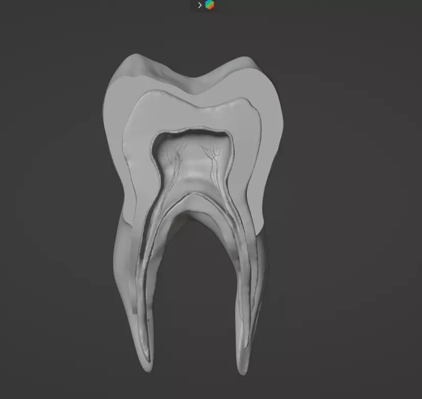 Split Tooth Model: A bisected tooth showing internal structures such as the enamel, dentin, pulp chamber, root canal, and blood vessels. This cutaway view helps explain the internal anatomy and dental health issues like cavities or root infections.