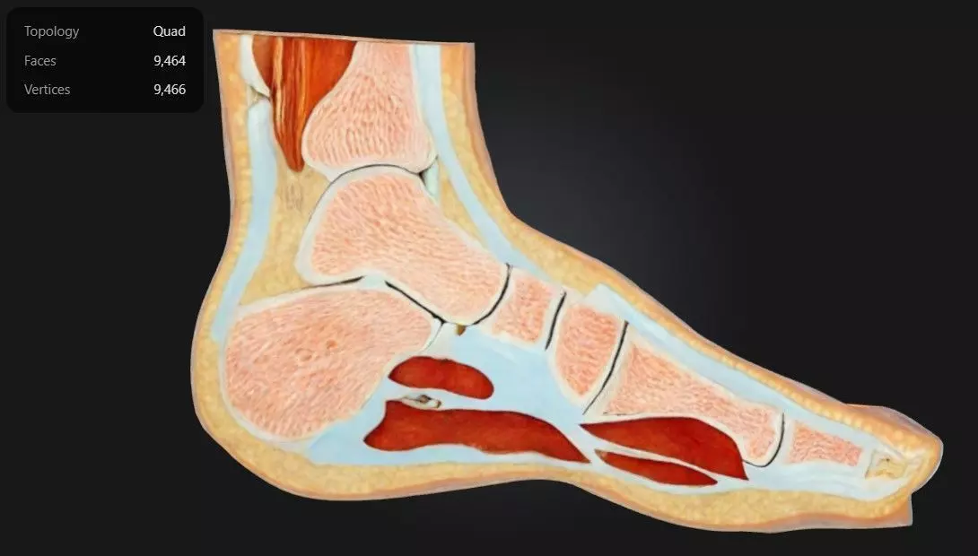 This 3D model of an Anatomy Feet Cross Section provides a highly detailed and anatomically accurate representation of the internal structures of the human foot. It highlights key components, including bones, muscles, tendons, ligaments, blood vessels, and nerves, offering a comprehensive view of the foot’s complex anatomy. The model effectively demonstrates the layers of tissues and their spatial relationships, making it an ideal tool for studying biomechanics, weight distribution, and movement.