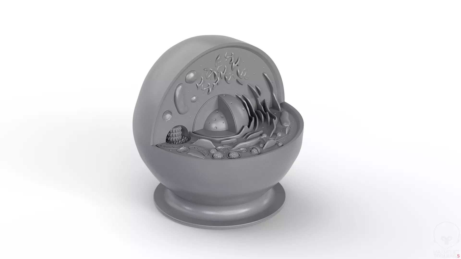 Detailed 3D model of an animal cell for FDM 3d printing. The model shows a cross-section (one-quarter cutaway) revealing the nucleus, mitochondria, endoplasmic reticulum, and other organelles. Perfect for 3D printing or educational projects.