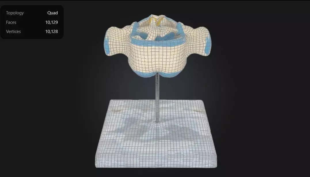This 3D model of an enlarged vertebra with spinal cord and nerves provides a highly detailed and anatomically accurate representation of the spinal column and its associated structures. It highlights the bony anatomy of the vertebra, including the vertebral body, pedicles, lamina, spinous process, and transverse processes, while showcasing the spinal cord, nerve roots, and intervertebral discs. The model effectively demonstrates the relationship between the vertebrae and the nervous system, illustrating the pathways of spinal nerves as they exit the spinal canal.