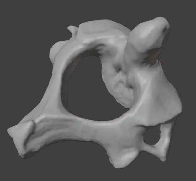 A professional-grade 3D anatomical model of the human second cervical vertebra (Axis, C2). Meticulously processed from a high-resolution scan of a real specimen. The Axis is the pivot point of the cervical spine, allowing the head to rotate.